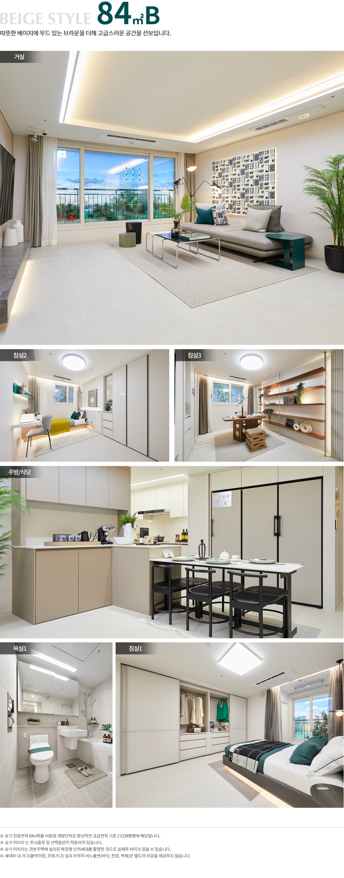 전용 59·84㎡가 주력이며 105㎡ 대형 라인업이 더해져 수요 스펙트럼을 넓혔습니다. 59A와 84A는 4베이 판상형으로 맞통풍과 채광이 우수하고, 알파룸과 대형 팬트리 등 유연한 수납 구성이 돋보입니다. 선택에 따라 알파룸을 와이드 다이닝이나 복도 팬트리로 바꾸는 등 라이프스타일에 맞춘 커스터마이징이 가능하다는 점도 매력입니다. 메인인 84B는 2베이 타워형·LDK 구조로 거실 개방감과 조망을 극대화한 타입으로, 가족 활동 공간의 밀도를 높이면서도 일조를 놓치지 않도록 계획했습니다. 실사용 빈도가 높은 주방·세탁·수납의 동선을 짧게 묶어 ‘하루의 피로’를 줄여주는 구성이 참 실용적입니다. 이런 평면 완성도는 광양 푸르지오 센터파크의 체감 가치를 키우는 핵심입니다.