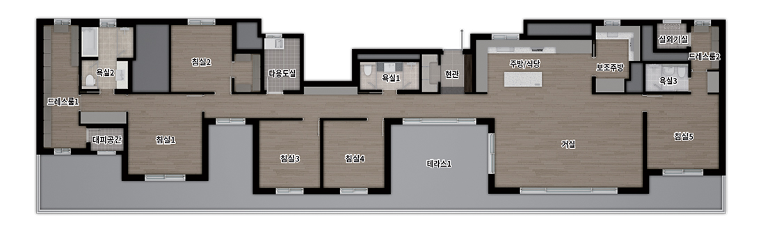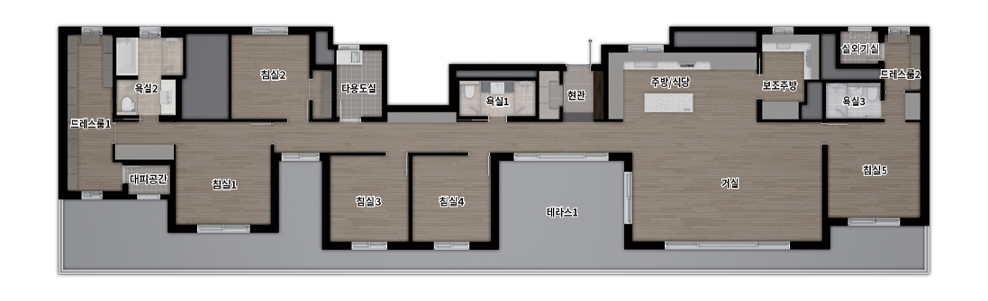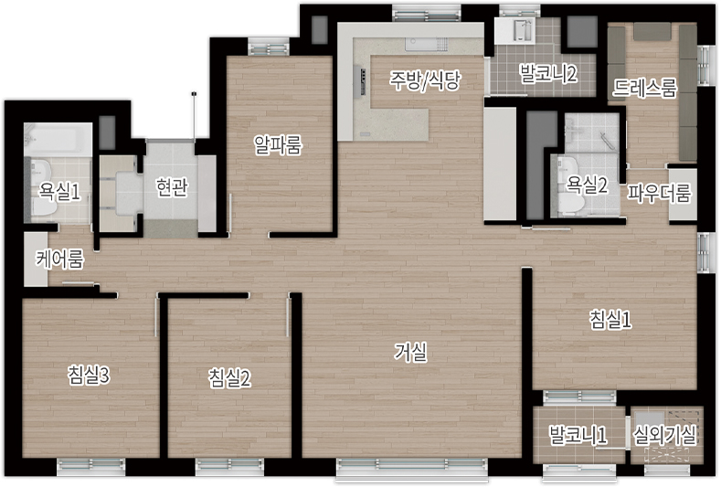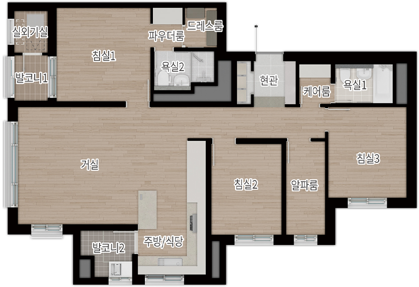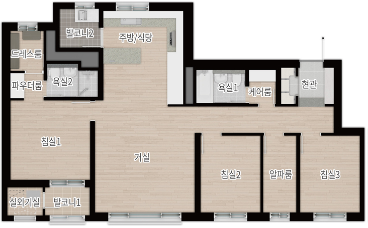실수요가 가장 선호하는 중형(전용 84㎡)을 주력으로 115㎡, 펜트하우스(134㎡ 이상)까지 준비해 선택 폭을 넓혔습니다. 더샵 광양레이크센텀의 84㎡ A~C는 4Bay 판상형에 맞통풍이 가능한 구조라 채광·환기 효율이 뛰어나고, 알파룸을 서재·취미실로 활용하기 좋습니다. ㄷ자 주방과 창 있는 드레스룸을 채용해 수납과 습기 관리가 수월합니다. 84㎡ D는 2Bay 타워형으로 LDK 일체형 거실이 주는 개방감이 돋보이며, ㄱ자 주방과 다용도실의 짧은 동선 덕분에 가사 효율이 높습니다. 더샵 광양레이크센텀은 타입별로 현관 수납, 팬트리, 알파룸을 세심하게 배치해 ‘수납이 넉넉한 집’을 찾는 수요에게 분명한 대안을 제시합니다.