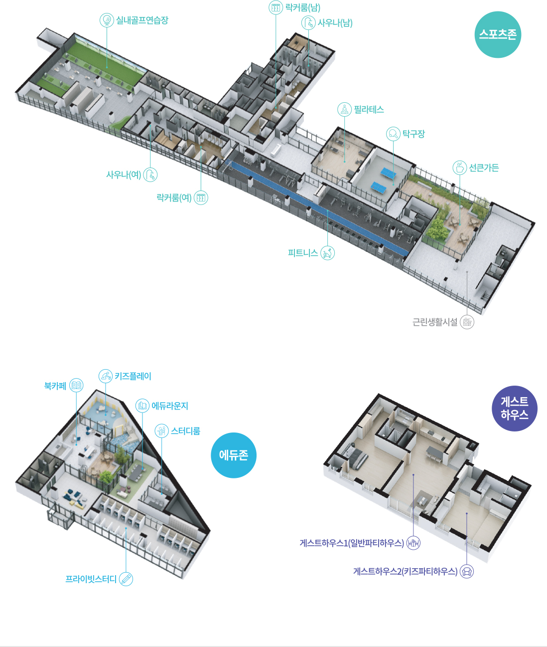 뒤로 가야산, 앞으로 마동호수·생태공원이 펼쳐지는 입지에 걸맞게, 지상은 공원형으로 구성했습니다. 주동은 남향 위주, 최장 148m 동간 이격으로 통경축과 채광을 확보했습니다. 더샵 광양레이크센텀에는 물놀이장, 산수정원, 좌우 소공원, 선큰 가든이 이어져 단지 안에서도 산책·휴식 동선이 완성됩니다. 스포츠존(피트니스·필라테스·사우나·탁구장)과 스크린 골프연습장, 북카페·스터디룸·프라이빗 독서공간을 갖춘 에듀존, 가족이나 지인을 초대하기 좋은 게스트하우스까지, 주말에 굳이 멀리 나가지 않아도 되는 생활 편의를 누릴 수 있습니다. 이처럼 더샵 광양레이크센텀은 ‘집 안팎이 모두 여가 공간’인 구성을 지향합니다.