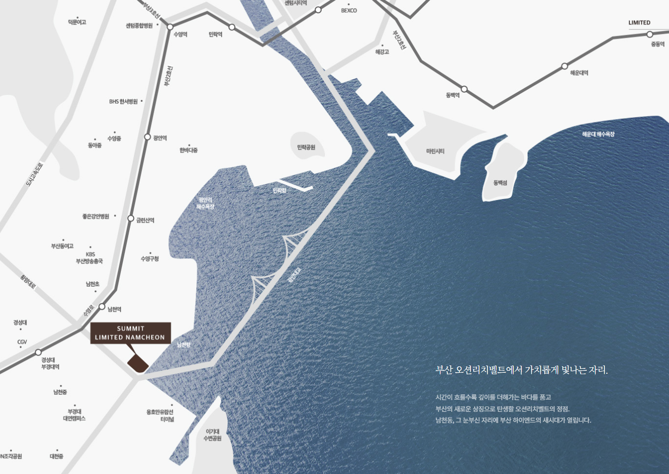 남천역을 도보로 이용하는 역세권 입지에 광안대교, 장산터널, 동해고속도로 접근성이 뛰어나 도심과 해안, 업무지구 이동이 편합니다. 남천초·남천중·광남초·부산동여고, 경성대와 부경대 대연캠퍼스까지 교육 인프라가 풍부하고, 역과 대학권을 따라 상권이 조성되어 일상 편의가 촘촘합니다. 광안리 해변과 수영강, 이기대공원, 시민공원 등 녹지 접근성이 좋아 퇴근 후에도 바다와 공원을 생활화할 수 있다는 점이 써밋 리미티드 남천의 생활적 가치를 높입니다.