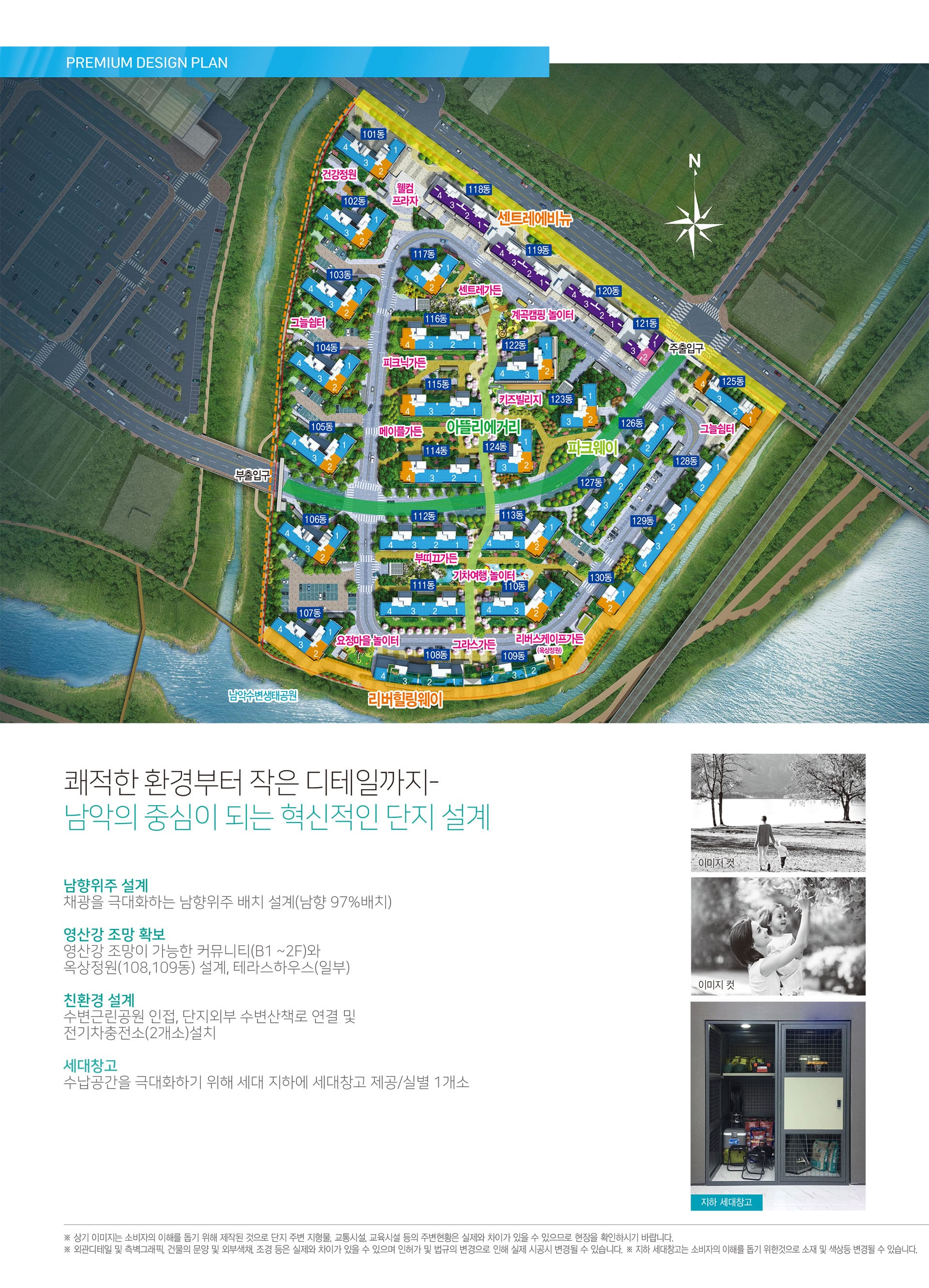 피트니스·GX·실내골프·작은도서관·독서실·연회장·카페 등 다채로운 커뮤니티를 갖추고, 약 170평 규모의 키즈빌리지와 단지 내 어린이 특화 공간을 도입했습니다. 지하 세대창고, 바이크 스테이션 2곳까지 더해져 수납과 취미 동선의 효율을 높였습니다. 남악 센트레빌 리버파크의 ‘생활 안에서 해결되는 편리함’이 체감 포인트입니다.